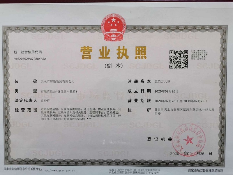 天水廣智通物流有限公司成立于2020年2月26日,法定代表人袁仲祥,注冊資本500萬元,主要從事道路貨物運輸、互聯(lián)網(wǎng)信息服務(wù)等業(yè)務(wù)。同時我們公司是智通三千互聯(lián)網(wǎng)平臺的合伙人之一。